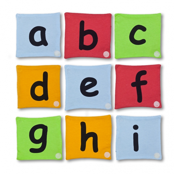 Lower case letters printed in black on coloured organic cotton jersey. Ideal for teaching children to spell or play word games. Available as a complete alphabet set or individual letters. Machine washable.