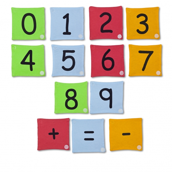 A great way to learn numbers, sequencing and sums. Clear black font on a range of different coloured squares of organic cotton jersey. Machine washable.